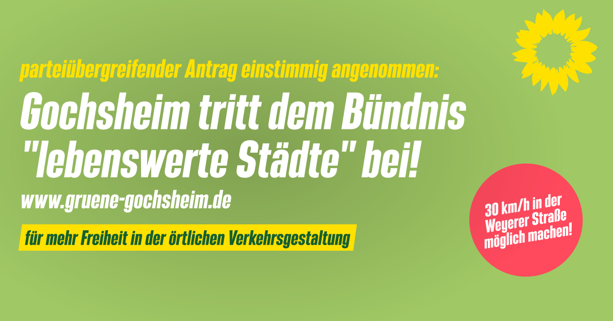 Aber wir bleiben trotzdem positiv! Unser Grünen-Gemeinderatsmitglied Peter Matl und Achim Eisend von den Freien Wählern haben einen Antrag gestellt, dem Bündnis „Lebenswerte Städte und Gemeinden“ beizutreten. Bereits etwa 850 Städte und Gemeinden fordern mehr Freiheit, die Geschwindigkeit auch dort zu reduzieren, wo es nach ihrer eigenen Einschätzung sinnvoll ist.