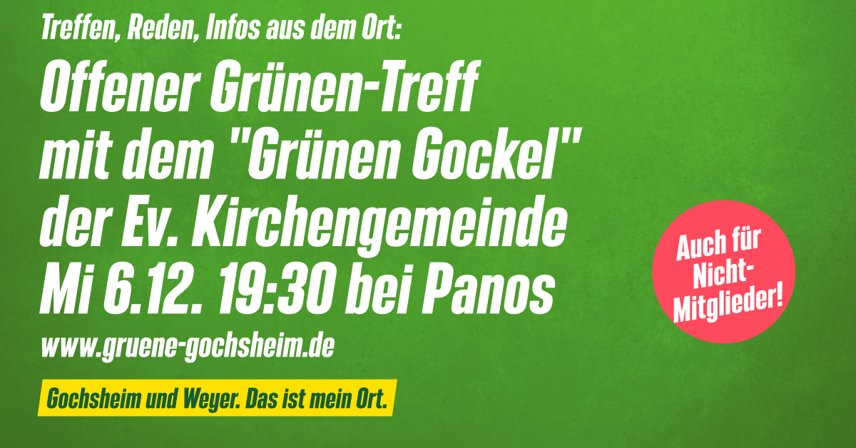Bei unserem alle zwei Monate stattfindenden offenen Grünen-Treff ist diesmal die Initiative „Grüner Gockel“ der Evangelischen Kirchengemeinde zu Gast. Sie berichten uns von dem Programm, das den Energieverbrauch der Kirchengemeinde und damit den CO2-Ausstoß deutlich senken konnte.